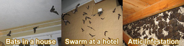 Above are some photos I've taken at various bat jobs. On the left, you can see a group of bats swirling inside a house. In the middle, is a huge swarm of bats, over 1000, entering and exiting a hotel 8 stories up. On the right is a photo inside an attic with a large bat infestation.