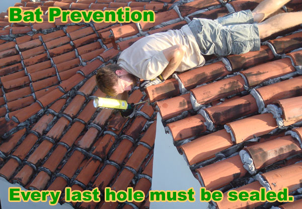 Because each ridge of a barrel tile roof must be sealed individually, it is a time consuming process. The most effective means of sealing the tiles is by installing steel cloth at the bottom of each ridge where the bats enter through. The steel cloth is woven with holes that are smaller than a bat can squeeze through. The weave allows for ventilation and drainage, but the bats can’t get through. The tiles are fitted with a piece of steel cloth, and the pieces are then drilled in. In order to ensure that no bats can enter, each ridge must have the steel cloth attached to it. You should also check other areas of the roof to ensure that there are no damaged areas, cracks, or gaps where the bats could enter. When they return from migration, they will be looking for a way to enter their former roost.
