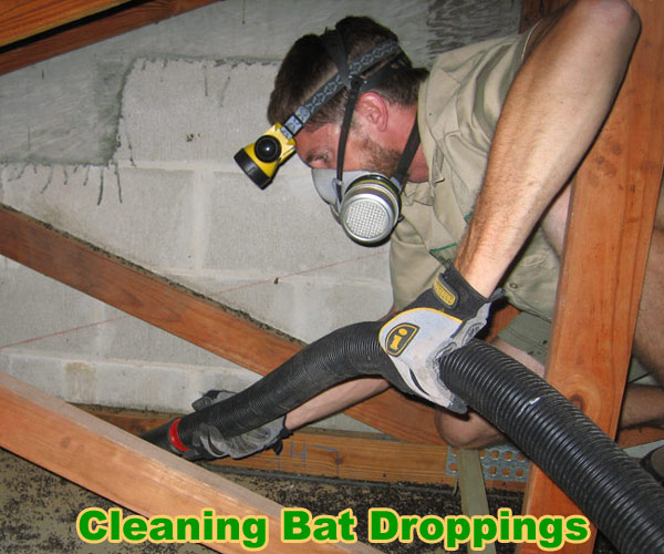 Once the bats are sealed out, then the cleanup of the guano can begin. Because of the health problems associated with bat guano, it is important that you are very careful or have professionals do this, as they are trained in safety precautions in dealing with hazardous waste materials. The first step in clean-up is to remove all of the loose guano from smooth surfaces, such as wood planks or concrete. This can be done using a vacuum that safely contains the hazardous waste products. Next, the bulk of the guano should be removed, by shovel if necessary, and placed in sealed bags. All excess guano should be vacuumed up with a filter vacuum cleaner. Next, all of the smooth surfaces should be scrubbed thoroughly with an enzyme-based cleanser. Walls can also be scrubbed with the enzyme cleaner to remove guano and urine stains.